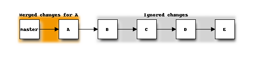 If changes A and B pass tests (green), and C, D, and E fail (red):